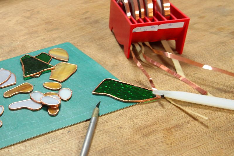 Bij tiffany worden de stukjes glas omwikkeld met koper folie en dan aan elkaar gesoldeerd. Nu is iedereen zelf in staat om deze kunst te leren.